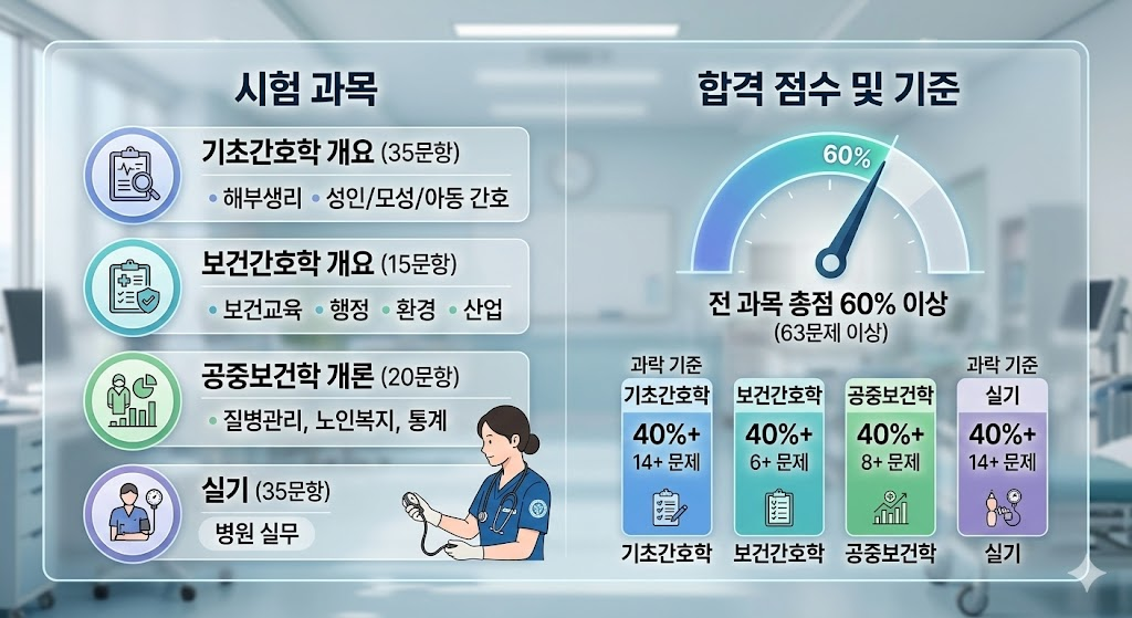 중요 포인트: 총점이 80점이 넘더라도, 특정 과목(예: 보건간호학)에서 5문제만 맞혔다면 과락으로 인해 불합격 처리됩니다. 따라서 취약 과목을 포기하지 않는 전략이 중요합니다.