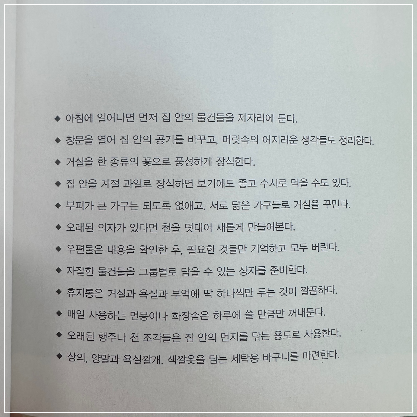 작가는 "집이 어수선하면 마음도 어수선해지고, 집이 정돈되면 삶도 정돈된다."라고 말하며, 정리의 궁극적인 목표는 단순한 청소가 아니라 삶을 풍요롭게 만드는 것이라고 강조하고 있다.